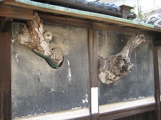 ![]() 塀に塗り込められた木 | ![]() 軒先の飾り |